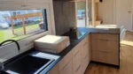 El interior de la autocaravana modelo A consta de un amplio salón con techo inclinado, un cuarto de baño y, según la versión, dos o tres dormitorios. La distribución funcional garantiza una vida cómoda para una familia de cuatro miembros, tanto si se trata de un chalet móvil de temporada como de una vivienda para todo el año. Los grandes ventanales y las puertas francesas contribuyen a la sensación de amplitud del interior.
