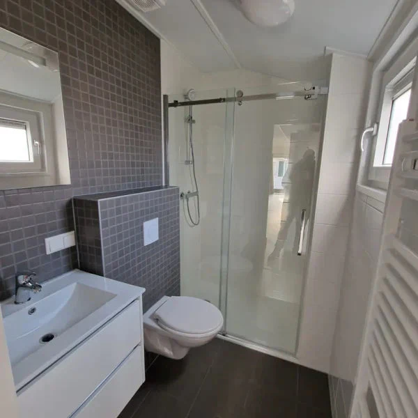 2x Somier 80 x 200 cm Dormitorio grande: Extractor mecánico Mezclador termostático 80× Plato de ducha 120 con estante y pared corredera