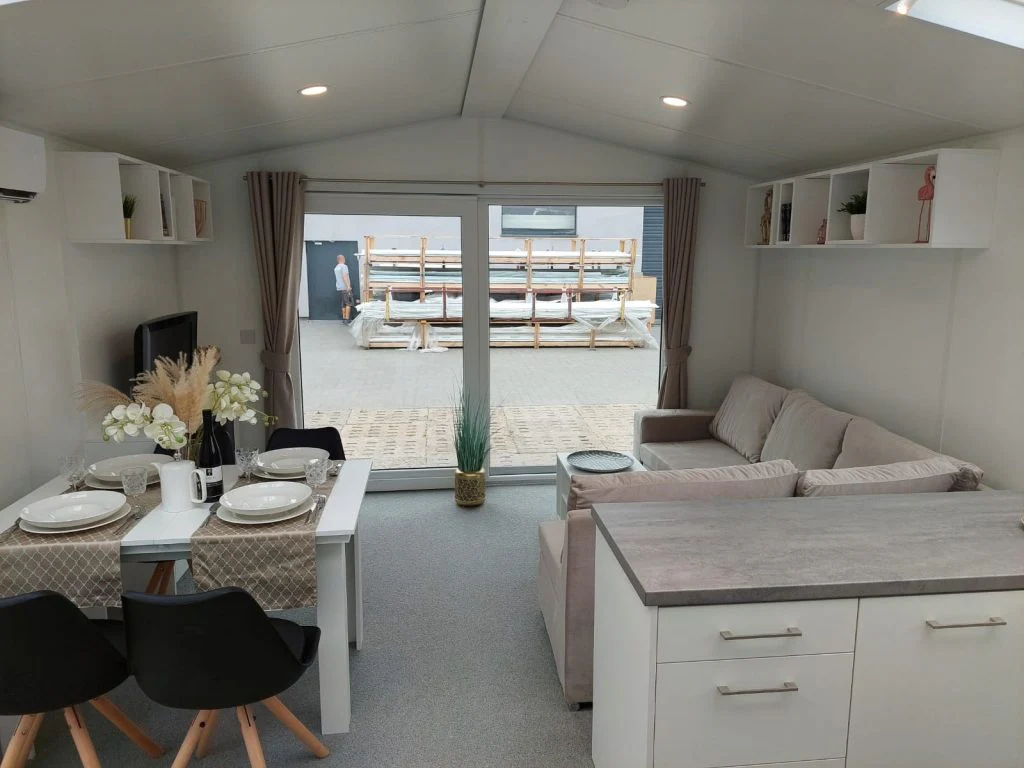 El sistema de ventilación de paredes y techo de la Capri elimina eficazmente la humedad, manteniendo un ambiente seco y agradable. Con perfiles de cinco cámaras y doble acristalamiento de seguridad, las ventanas y puertas brindan mayor seguridad y eficiencia energética. El interior está revestido con paneles de yeso impermeables y antibacterianos, lo que garantiza un fácil mantenimiento y una apariencia renovada.